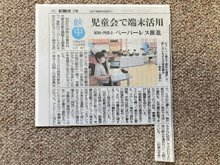 混迷する社会を背景として,教育界も多くの課題を抱えています。誰もが経験する,中学校に入学した途端に感じる大きな壁。所謂「中1ギャップ」もその1つです。文部科学省は,小中一貫校の創設によってこの課題の解決に取り組もうとしている感があります。が,そう簡単に事は運びません。そんな中,昭和町立の学校は,初めの1歩として「小中連携」を模索しています。今日は,押小出身の押中生が「あいさつ運動」として本校に来校くださり,本校児童会本部と協働して,昇降口であいさつ運動を展開してくれました。今後は6年生が中学校を訪問し,中学校の「水」に慣れる機会が設定できればと,考えています。さて,本日中休み,3年生以上の各クラスの代表者が集う児童会の代表委員会が開催されました。また,この模様を,山梨日日新聞の杉原記者が取材してくれました。本校児童会は今年度に入ってから,学校のESD(SDGs)の取組に呼応して,会議のペーパレス化に取り組んでいます。児童会本部(6-2青栁会長)がPCを使って作った資料をClassroomなるアプリケーション内に保存し,代表委員は各自のノートPCでその資料(データ)を呼び出し,見ながら会議を進めるといったものです。取材後,杉原記者が「小学生がPCを上手に使いこなしていたことに驚きました。さらに,資料も小学生がPCを使って自分たちで作成していたことにも驚きました」と誉めてくださいました。